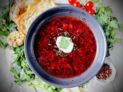 Борщ приготовлен на наваристом бульоне, подается со сметаной, ржаным хлебом и салом. В составе: говяжий бульон, капуста, морковь, картофель, лук репчатый, свекла, специи, капля уксуса и щепотка сахара.