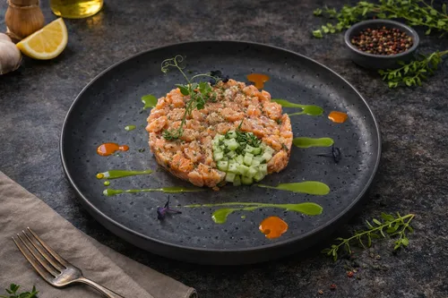 Свежий лосось, каперсы, шалот и свежий огурец - прекрасная и легкая закуска, подойдет для начала трапезы и к вину