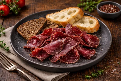 Тонкие слайсы вяленого мяса с перечной обмазке, рекомендуем как легкую закуску и аперитив к пиву