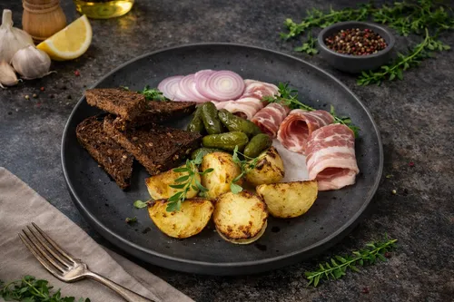 Классическое сочетание сальца, картошечки, ржаного хлебушка, лучка и корнишонов - лучше не придумать...