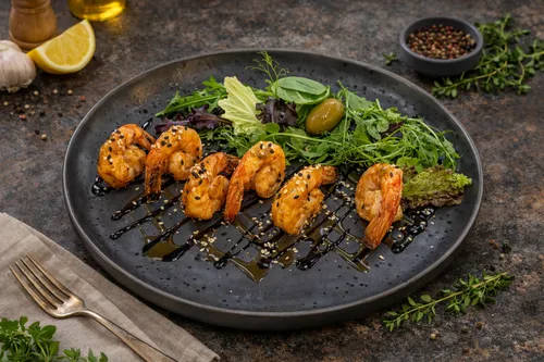 Королевские креветки в остро-сладком соусе с кунжутом и миксом салатов.
