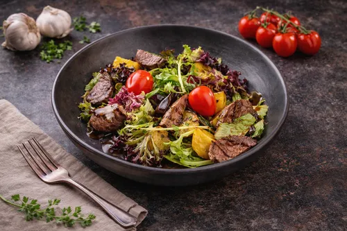 Нежная говядина, сочные помидоры черри, картофель, шампиньоны, микс-салат, пармезан, миндаль и бальзамический соус. Энджой!