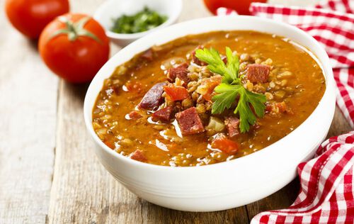 Это густой наваристый суп с красной чечевицей и овощами. Готовится на говяжьем бульоне, с добавлением чили перца и овощей. Мясо брискета и копченая сметана довершают композицию осеннего вкуса.