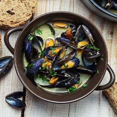 Мидии в соусе Том Ям: мидии в створках, паста том ям, сливки, кинза. Подаются с чиабаттой