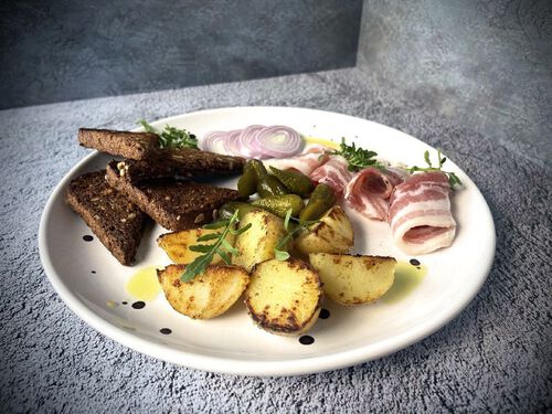 Классическое сочетание сальца, картошечки, ржаного хлебушка, лучка и корнишонов - лучше не придумать...