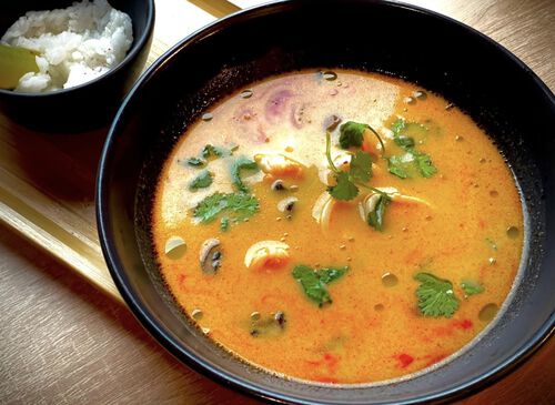 Очень вкусный Том Ям, приготовленный по классической рецептуре. Подается с рисом. В составе: куриный бульон, соевая паста том ям, лемонграсс, лайм, галангал, соус рыбный, Чили, кокосовое молоко, сахар, соль, перец, креветки, кальмар, древесные грибы, шампиньоны, кинза.
