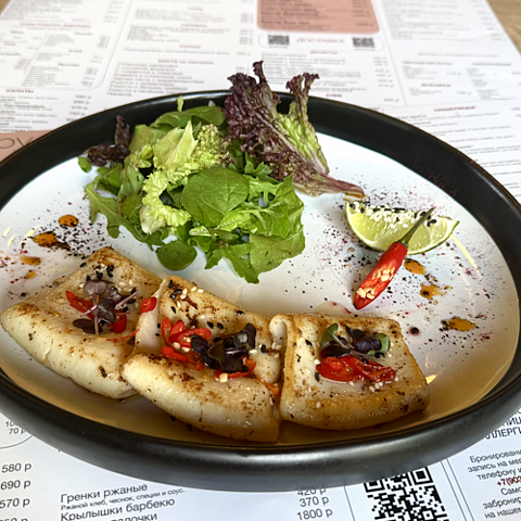 Нежный кальмар, обжаренный с добавлением белого вина. Подается с цедрой лайма, острым чили и микс салатом.