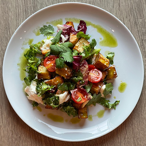 Сочетание хрустящих баклажанов, сочных томатов и ароматной зелени в этом ярком салате с жаренными баклажанами, помидорками черри, микс салата, страчателлой идеально дополнены пикантной остро-сладкой заправкой.