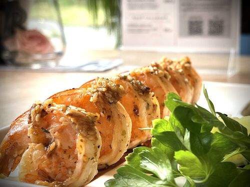 Королевские креветки в остро-сладком соусе с кунжутом и миксом салатов.